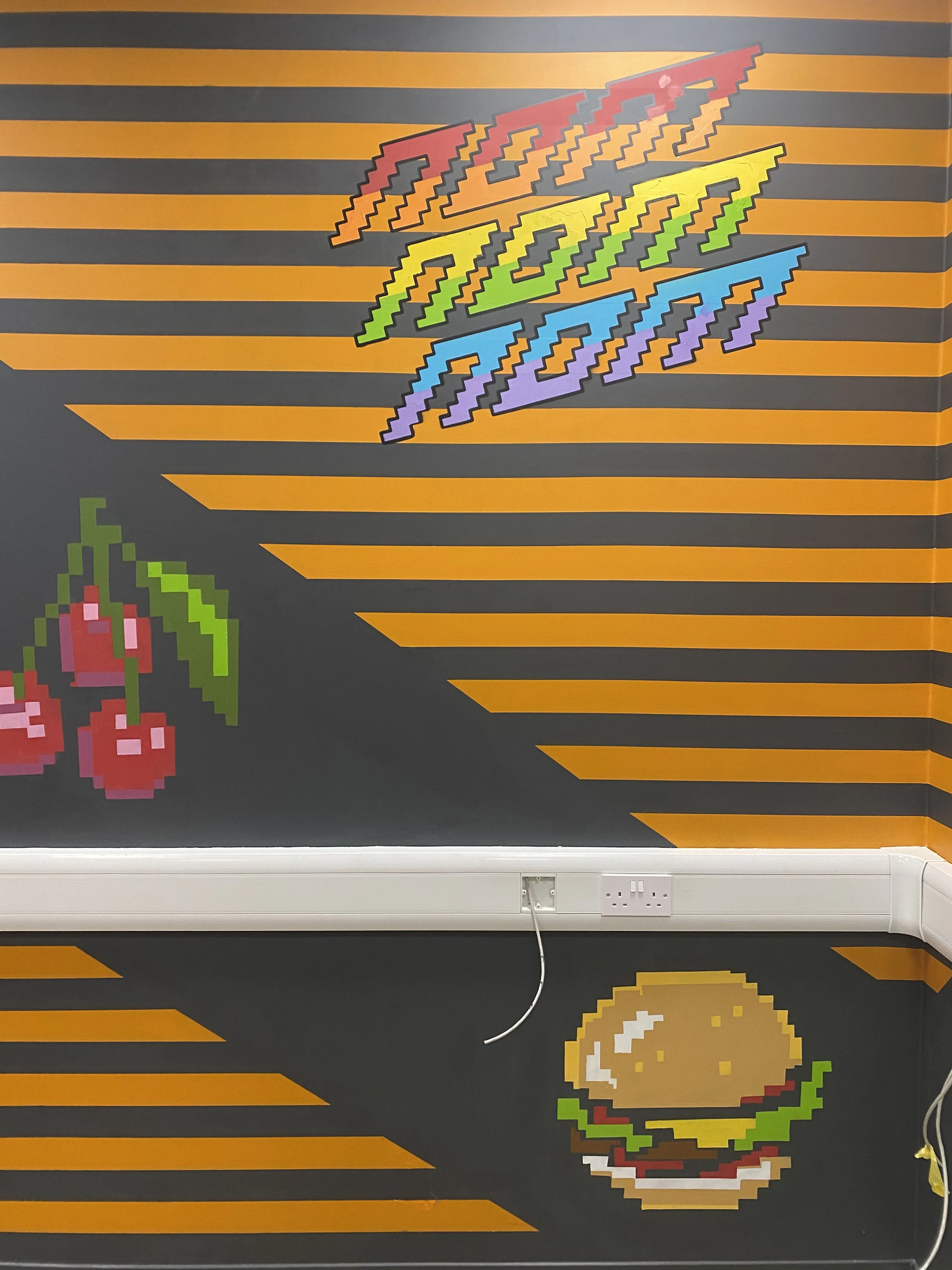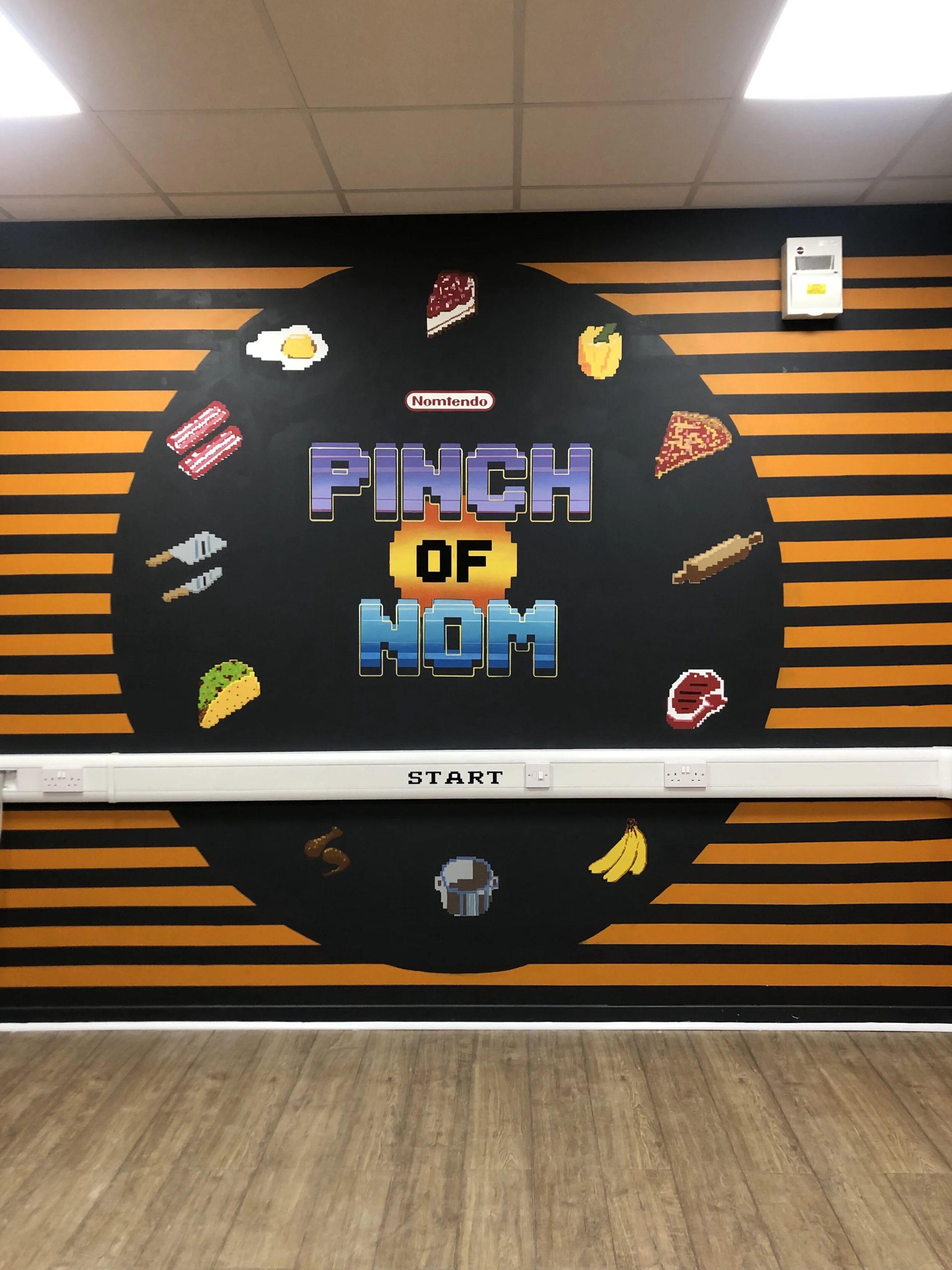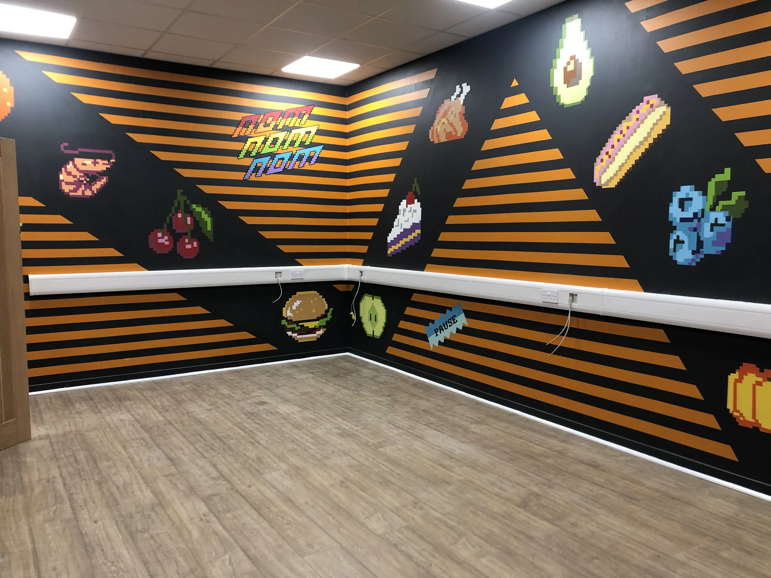 The brief was to make the most exciting and bright games room possible. They wanted to reference their love of gaming especially retro and early bit games. We decided to go with pixelated imagery taken from bit games and turn the room into the inside of a Pinch of Nom game inspired by early Nintendo and Amiga games.