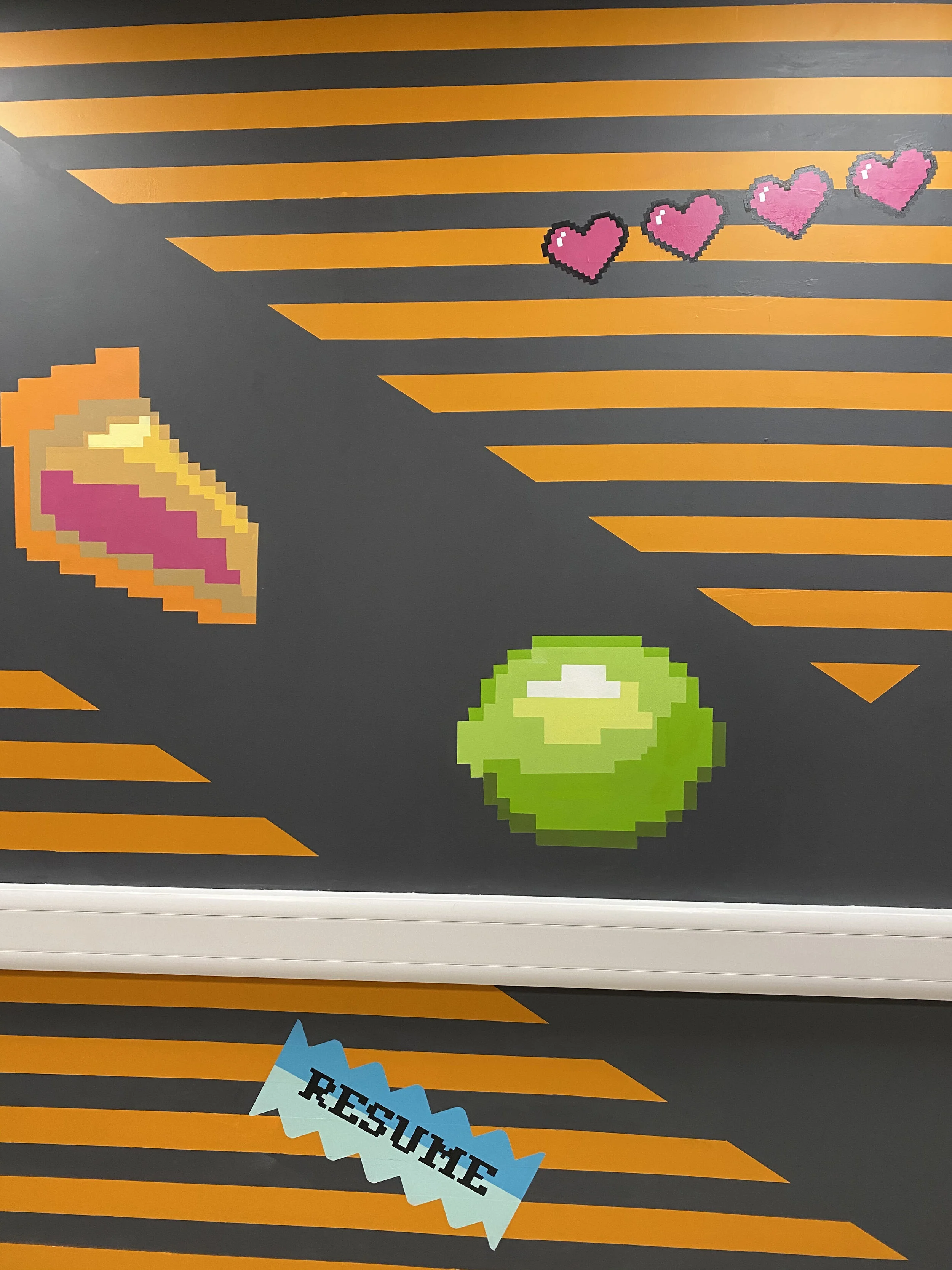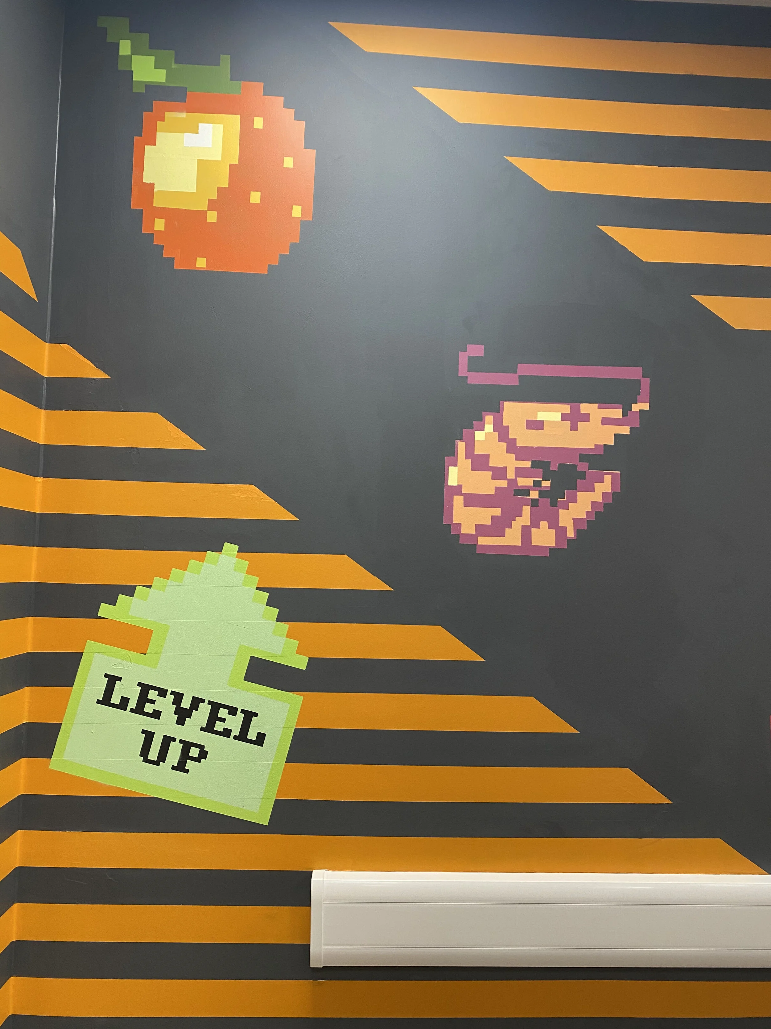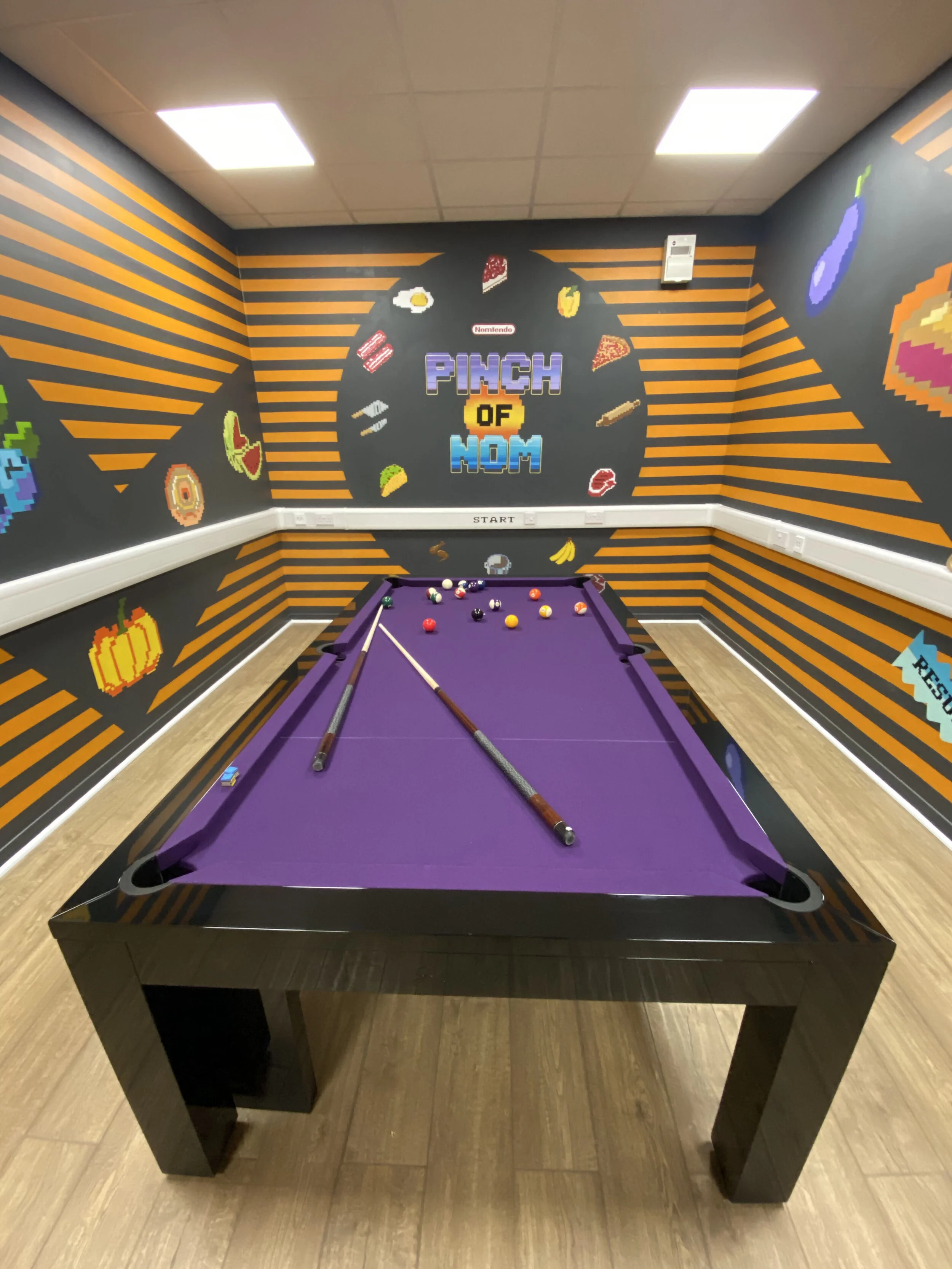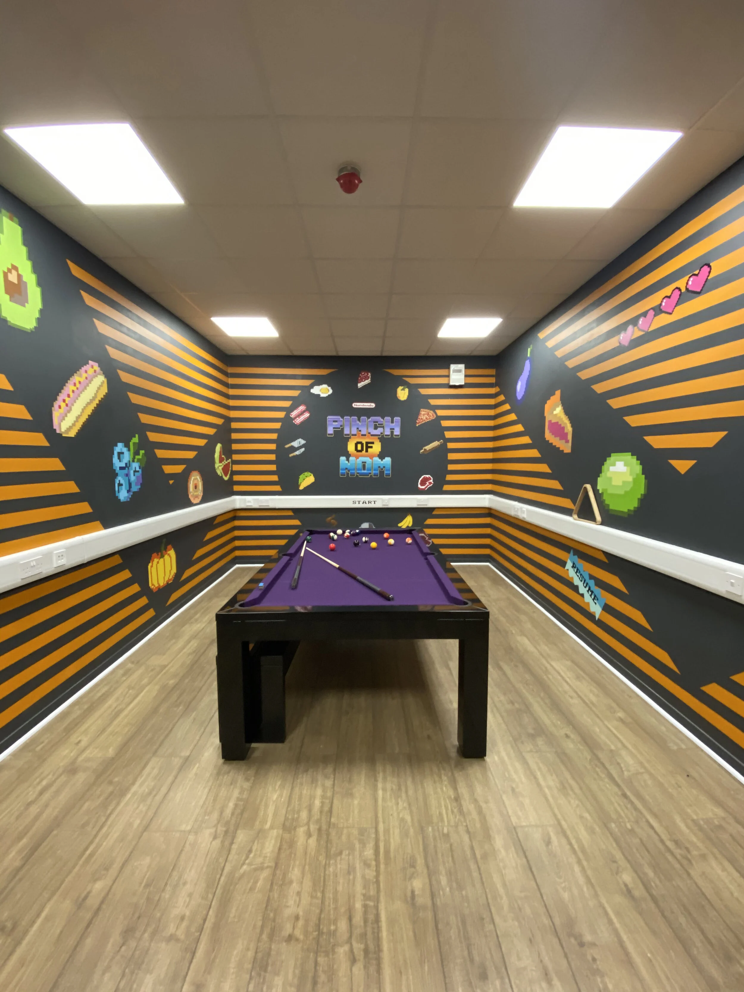 The brief was to make the most exciting and bright games room possible. They wanted to reference their love of gaming especially retro and early bit games. We decided to go with pixelated imagery taken from bit games and turn the room into the inside of a Pinch of Nom game inspired by early Nintendo and Amiga games.